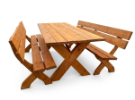 Dużą zaletą zestawu jest jego masywna konstrukcja oraz praktyczne wymiary. Blat stołu ma 88,5 cm szerokości, 200 cm długości, a grubość deski wynosi 45 mm. Ławka została wykonana z desek o grubości 45 mm, a szerokość siedziska i oparcia wynosi 30,5 cm przy długości 200 cm. Takie parametry zapewniają wygodę użytkowania, stabilność oraz odpowiednią wytrzymałość, dzięki czemu komplet dobrze sprawdza się w intensywnie użytkowanych przestrzeniach ogrodowych.